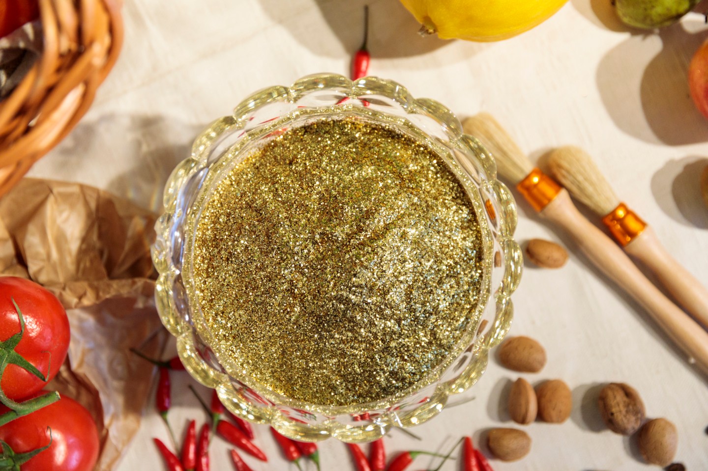 The commissioned artwork, Feast of Pollen Gold, comments on a dystopian near future scenario, where a lack of pollinators causes a drastic reduction in the fruits and vegetables that we are used to consuming as part of our daily diet.
