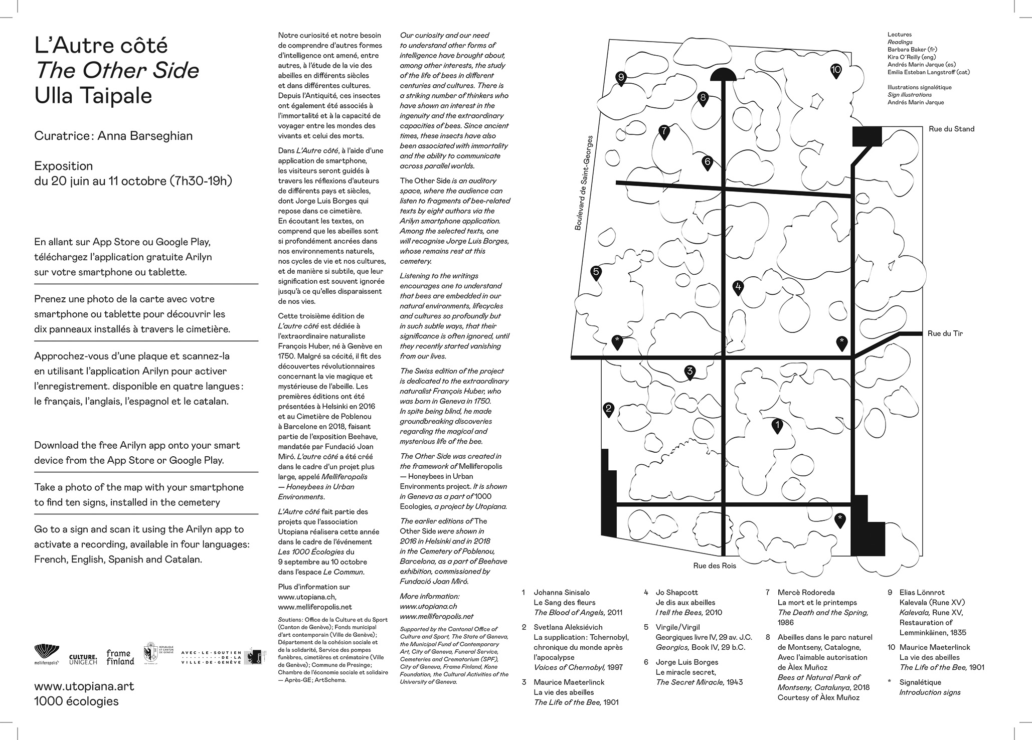 de la cohésion sociale et de la solidarité, Service des pompes funèbres, cimetières et crématoire (Ville de Genève); Commune de Presinge, Frame Finland; Activités culturelles de l’Université de Genève; Chambre de l’économie sociale et solidaire – Après-GE; Melliferopolis; ArtSchema; Kone Foundation.